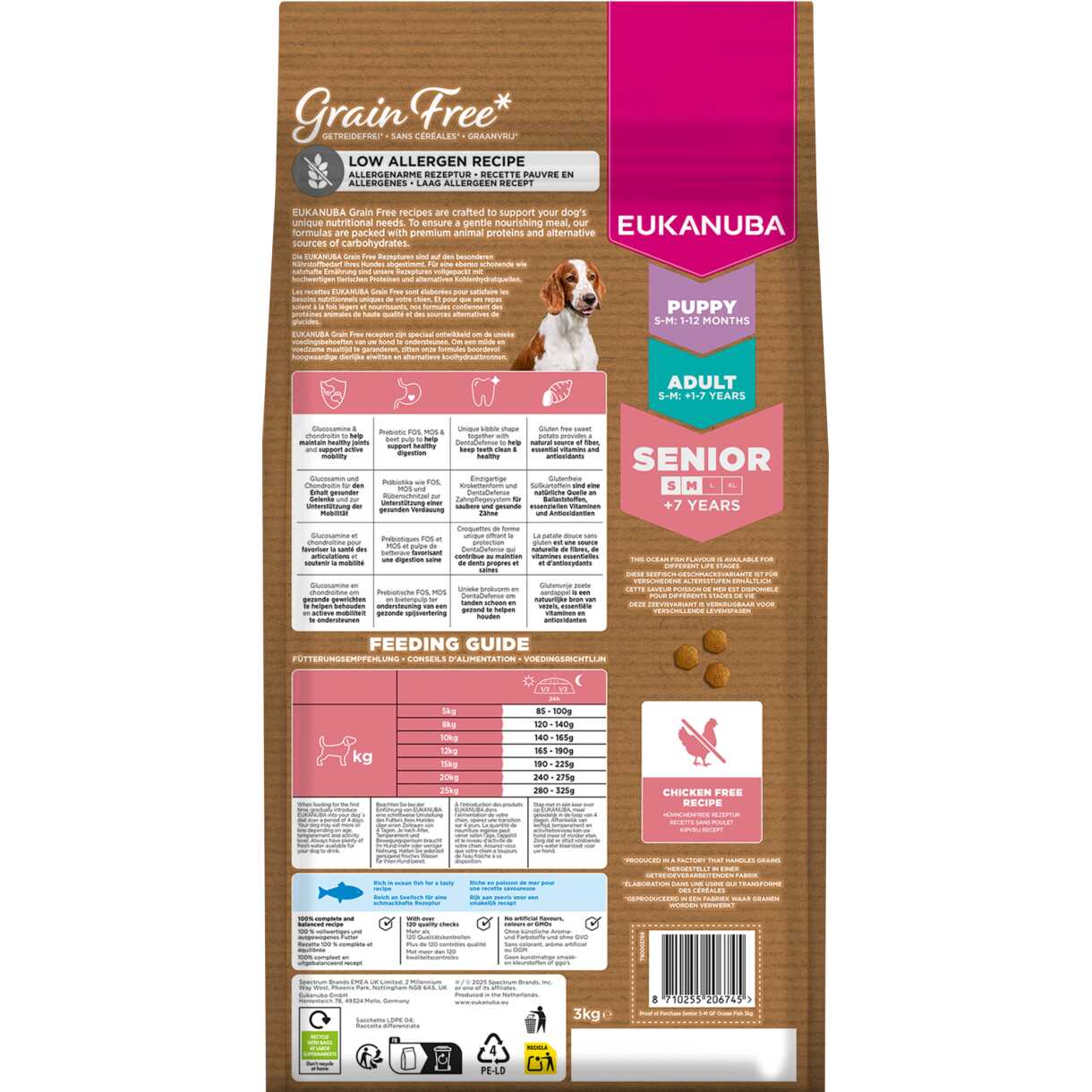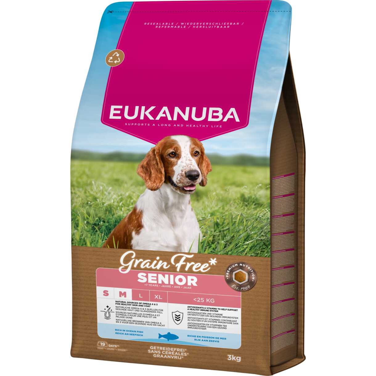 EUKANUBA getreidefreies Hundefutter mit hohem Seefischanteil für ausgewachsene Hunde kleiner und mittlerer Rassen ist eine allergenarme Rezeptur, die sorgfältig formuliert wurde, um häufige Allergene zu vermeiden. Die milde Rezeptur enthält glutenfreie Süßkartoffeln, die eine natürliche Quelle für Ballaststoffe und Mineralien sind. Zur Erhaltung gesunder Gelenke und zur Unterstützung einer aktiven Beweglichkeit enthält dieses Futter Glucosamin. Darüber hinaus enthält diese hühnerfreie Rezeptur nur Fisch als Quelle für tierisches Protein. Zur weiteren Unterstützung einer gesunden Verdauung ist das Futter reich an den Präbiotika FOS/MOS und Rübenschnitzel. Darüber hinaus bietet EUKANUBA Grain Free* ein Trockenfutter für ältere Hunde kleiner und mittlerer Rassen, das reich an Meeresfisch und Omega-3-Fettsäuren aus natürlichen Quellen ist. Die spezielle Pelletform in Verbindung mit dem einzigartigen DentaDefense hilft, die Zähne Ihres Hundes sauber und gesund zu halten. All diese hochwertigen Inhaltsstoffe unterstützen das Wohlbefinden Ihres Hundes.
