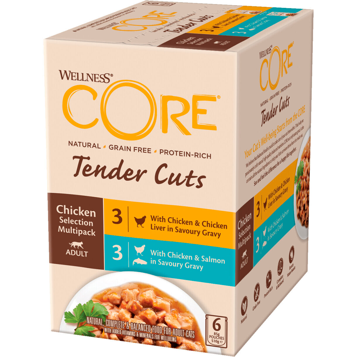 Unser Wellness CORE Tender Cuts Chicken Selection Multipack ist ein getreidefreies, natürliches, langsam gegartes, zartes Geflügelfleisch in Kombination mit gesundem Gemüse und Obst, serviert in herzhaften Saucen für einen unwiderstehlichen Geschmack.