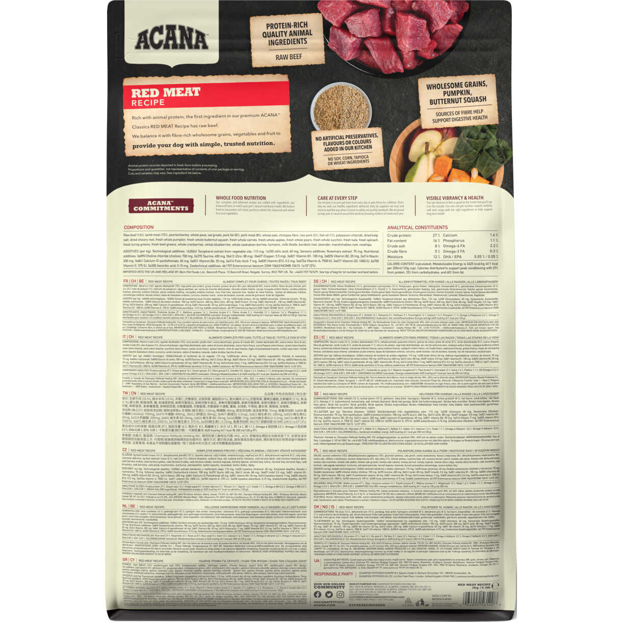 ACANA™ Classics Red Meat Trockenfutter für Hunde aller Lebensphasen besteht aus rohem Rind-, Lamm- und Schweinefleisch, Obst und Gemüse sowie gesundem Getreide, das Ihr Tier braucht, um glücklich, gesund und stark zu bleiben. Diese Kroketten unterstützen das Immunsystem, eine gesunde Verdauung sowie eine gesunde Haut und ein gesundes Fell. Sie enthalten nur hochwertige Zutaten und keine künstlichen Aromen, Farbstoffe oder Konservierungsmittel.