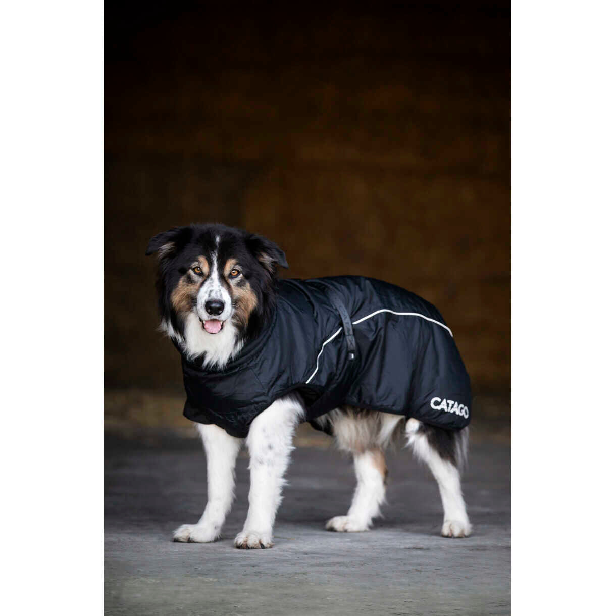 Warme Winterdecke für Hunde mit FIR-Tech-Technologie von Catago. Wohltuende entzündungshemmende und wärmende Wirkung durch die Keramikpartikel. Reflektierende Paspeln und Logos für erhöhte Sichtbarkeit. Elastische Beingurte mit integriertem Roll-Down-Hals und Bauchlatz. Gummierte Reißverschlussöffnung im Nacken zur Verwendung mit einem Geschirr.