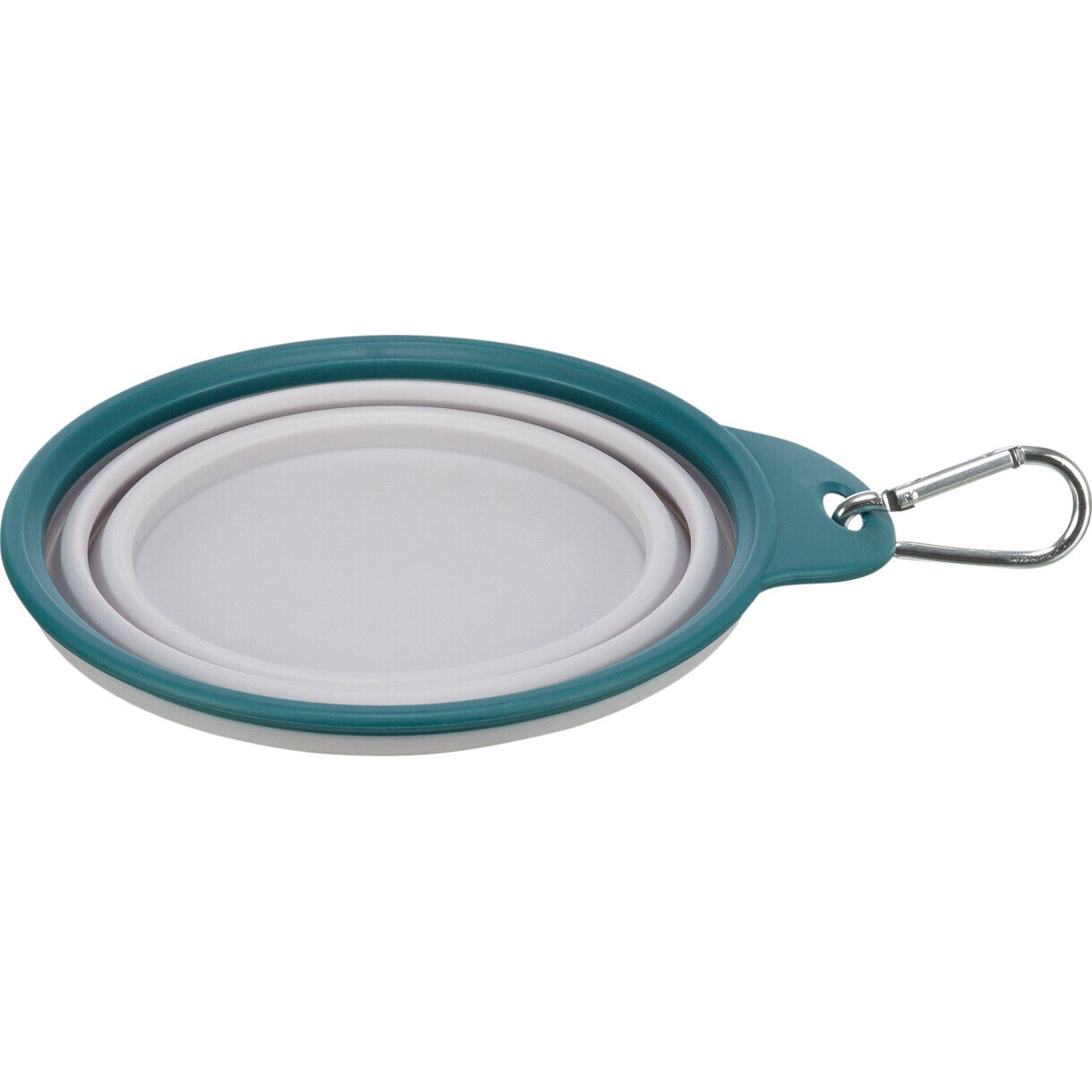 Reiseschale aus strapazierfähigem TPR-Material mit stabilem Rand. Praktisch, um Ihrem Haustier unterwegs Wasser oder Futter zu geben. Leicht zu falten und aufzubewahren.