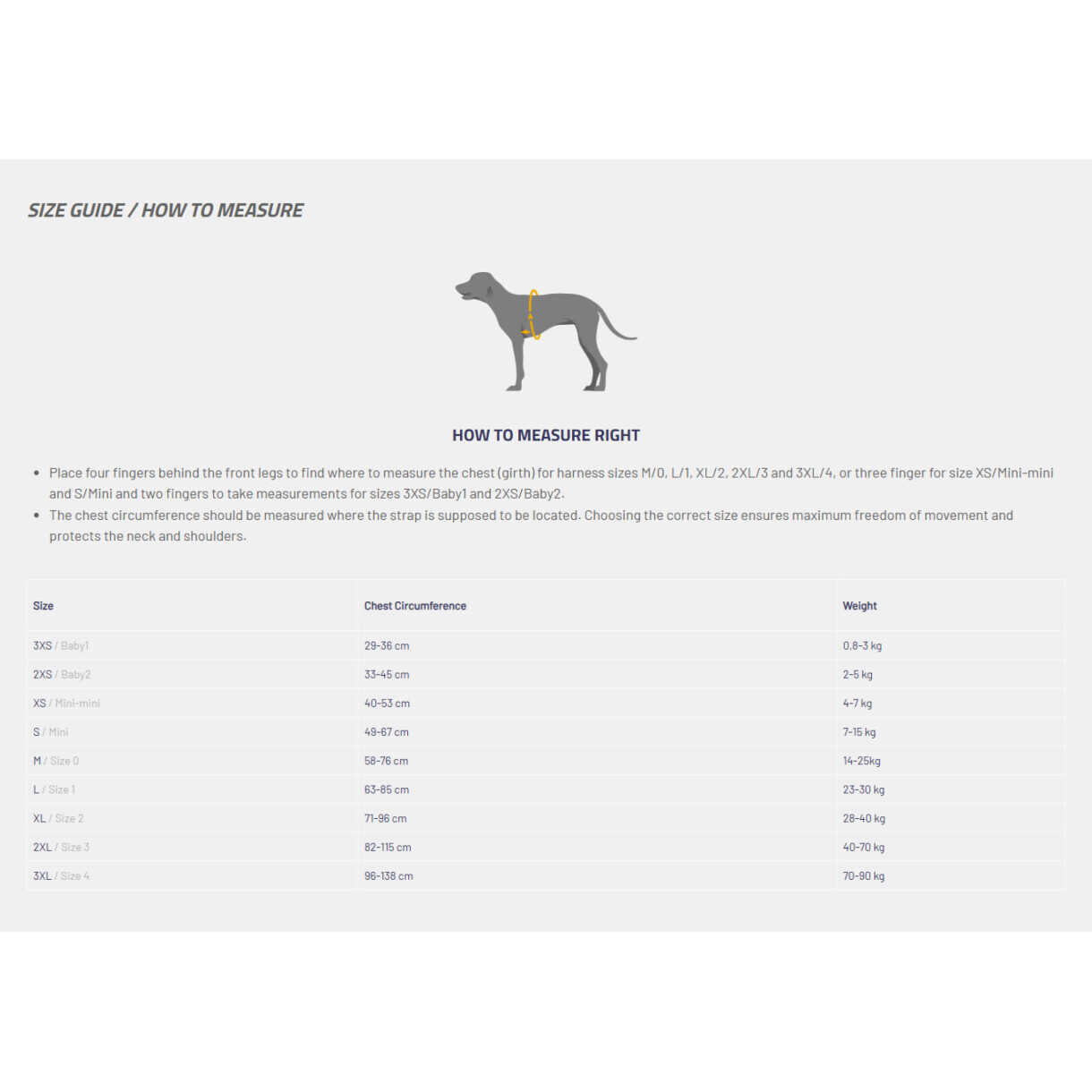 Es ist wichtig, dass Sie Ihren Hund sorgfältig ausmessen, um die richtige Größe des Geschirrs zu wählen. Legen Sie vier Finger hinter die Vorderbeine, um zu bestimmen, wo der Brustumfang (Umfang) für die Geschirrgrößen 0, 1, 2, 3 und 4 zu messen ist, drei Finger für die Größen Mini-mini und Mini und zwei Finger für die Größen Baby 1 und Baby 2.