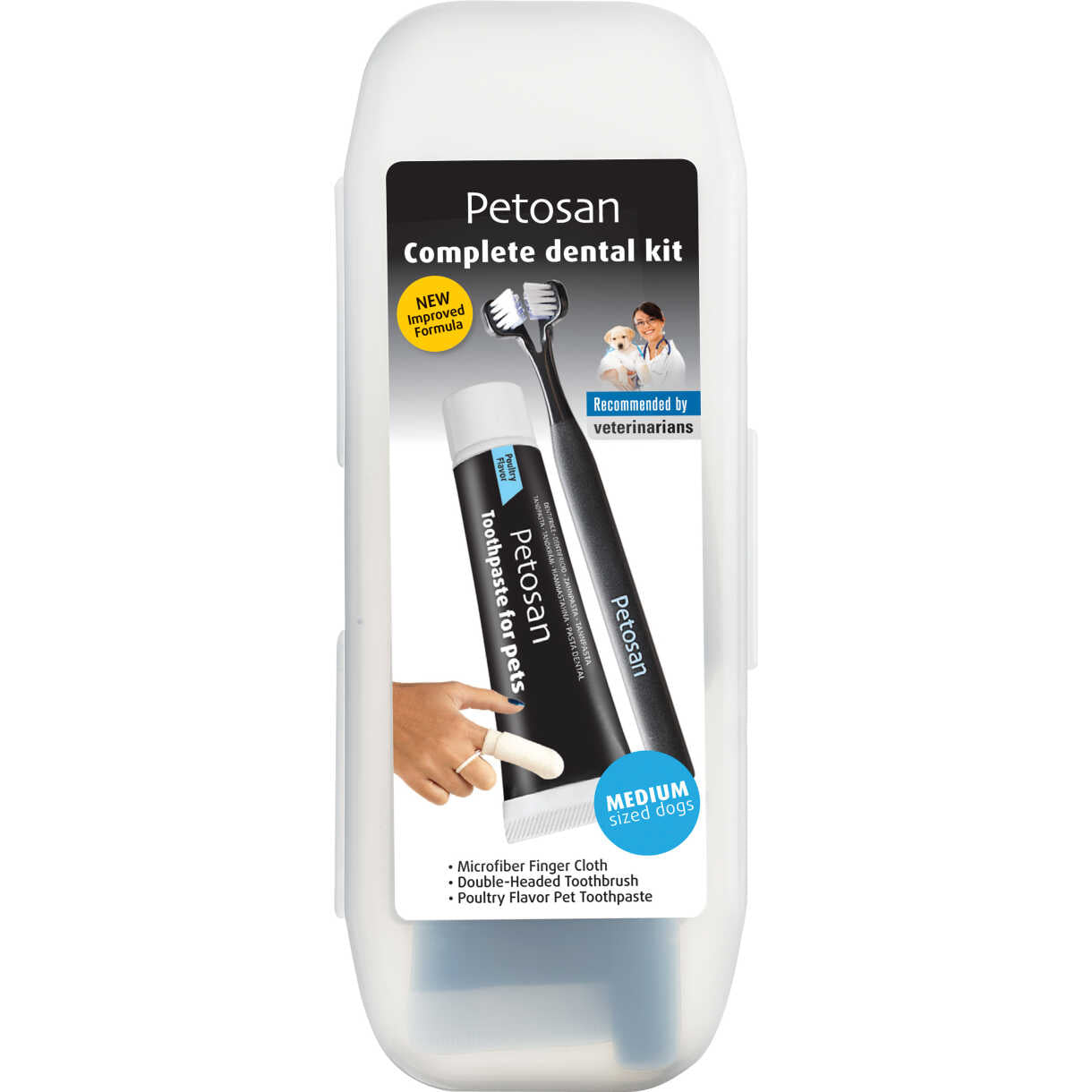 Petosan Complete Dental Kit bietet alles, was Sie für eine gesunde Zahnpflege Ihres Hundes benötigen. Dieses ultimative Kit wird in einem eleganten Etui geliefert und enthält eine Reihe von Werkzeugen für eine effektive Zahnpflege. Mit einer doppelseitigen Zahnbürste und einer Mikrofaser-Fingerzahnbürste erreichen Sie alle Bereiche im Maul Ihres Hundes, und die enthaltene Zahnpasta mit leckerem Hühnergeschmack macht das Zähneputzen zu einem angenehmen Erlebnis. Egal, ob Ihr Hund klein, mittelgroß oder groß ist, dieses Set gibt es in den passenden Größen für jede Rasse, so dass Sie die Mundhygiene Ihres Hundes auf einfache und bequeme Weise sicherstellen können.