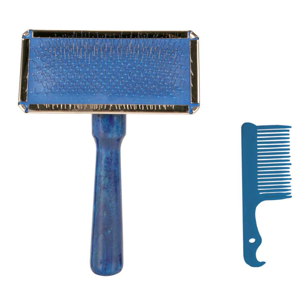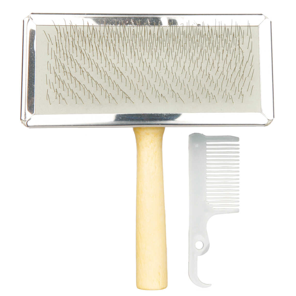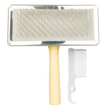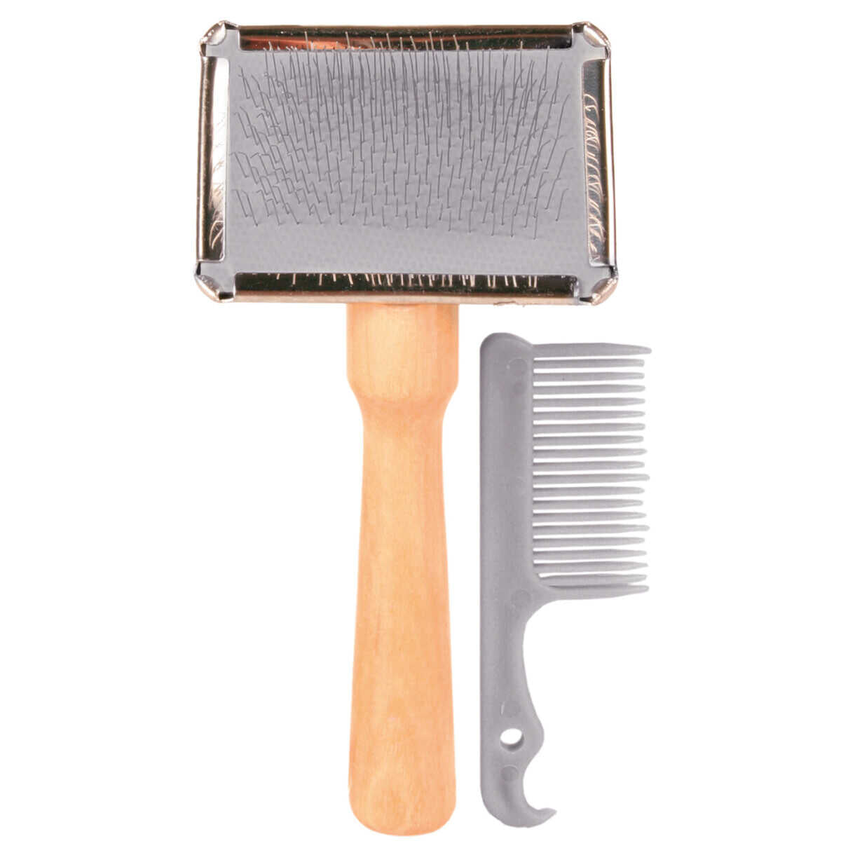 Die Karde mit Holzgriff ist ein praktisches Werkzeug für die Fellpflege Ihres Hundes. Sie hat weiche Metallborsten, die lose Haare effektiv entfernen und verfilztes Fell entwirren. Im Lieferumfang ist ein Reinigungskamm enthalten, mit dem sich die Haare nach dem Gebrauch leicht aus der Bürste entfernen lassen, so dass sie für das nächste Mal immer bereit ist. Mit ihrem ergonomischen Holzgriff liegt sie gut in der Hand und bietet einen angenehmen Griff während des Gebrauchs.