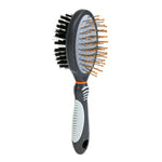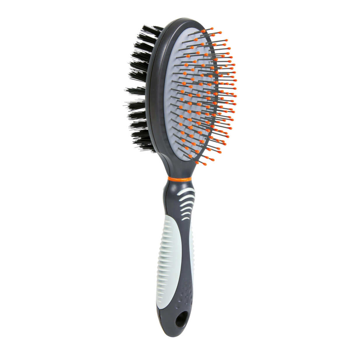 Eine Seite hat Nylonborsten, während die andere Seite Metallborsten mit Stiften hat. Die Nylonborsten eignen sich hervorragend zum Lösen und Entwirren von abgestorbenem Fell und Schmutz, während die Metallborsten mit ihren Spitzen lose Haare entfernen und tiefer in das Unterfell eindringen. Der Kunststoffgriff mit Gummigriff bietet einen bequemen und sicheren Halt bei der Anwendung.
