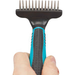 Ein Striegel für verfilztes Langhaar mit Schwerpunkt auf der Pflege der Unterwolle. Die Zahnlänge beträgt 2 cm und er hat einen Kunststoffgriff mit Gummi-/Metallgriff für eine komfortable und effiziente Handhabung. Geeignet für die Pflege des Fells und der Unterwolle.