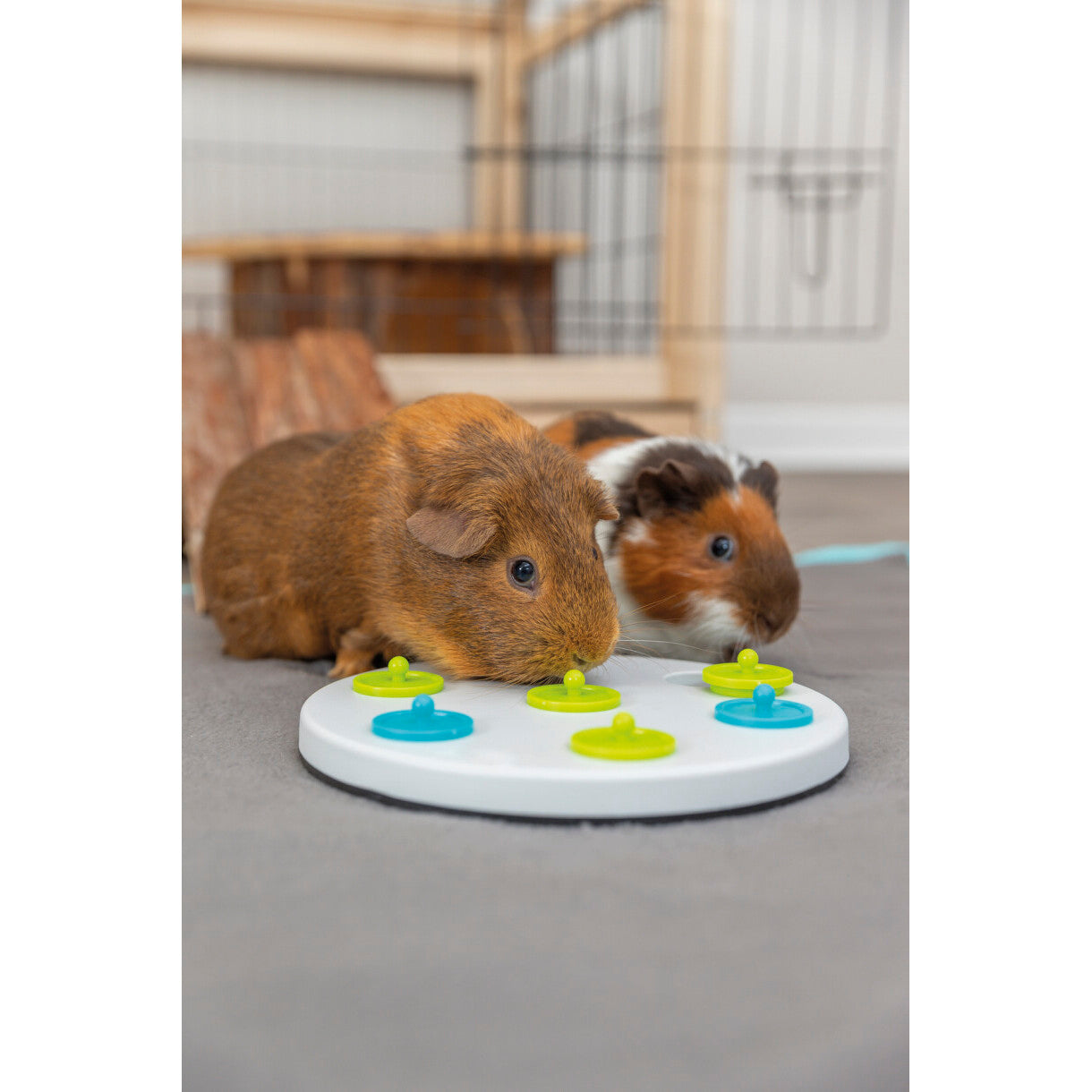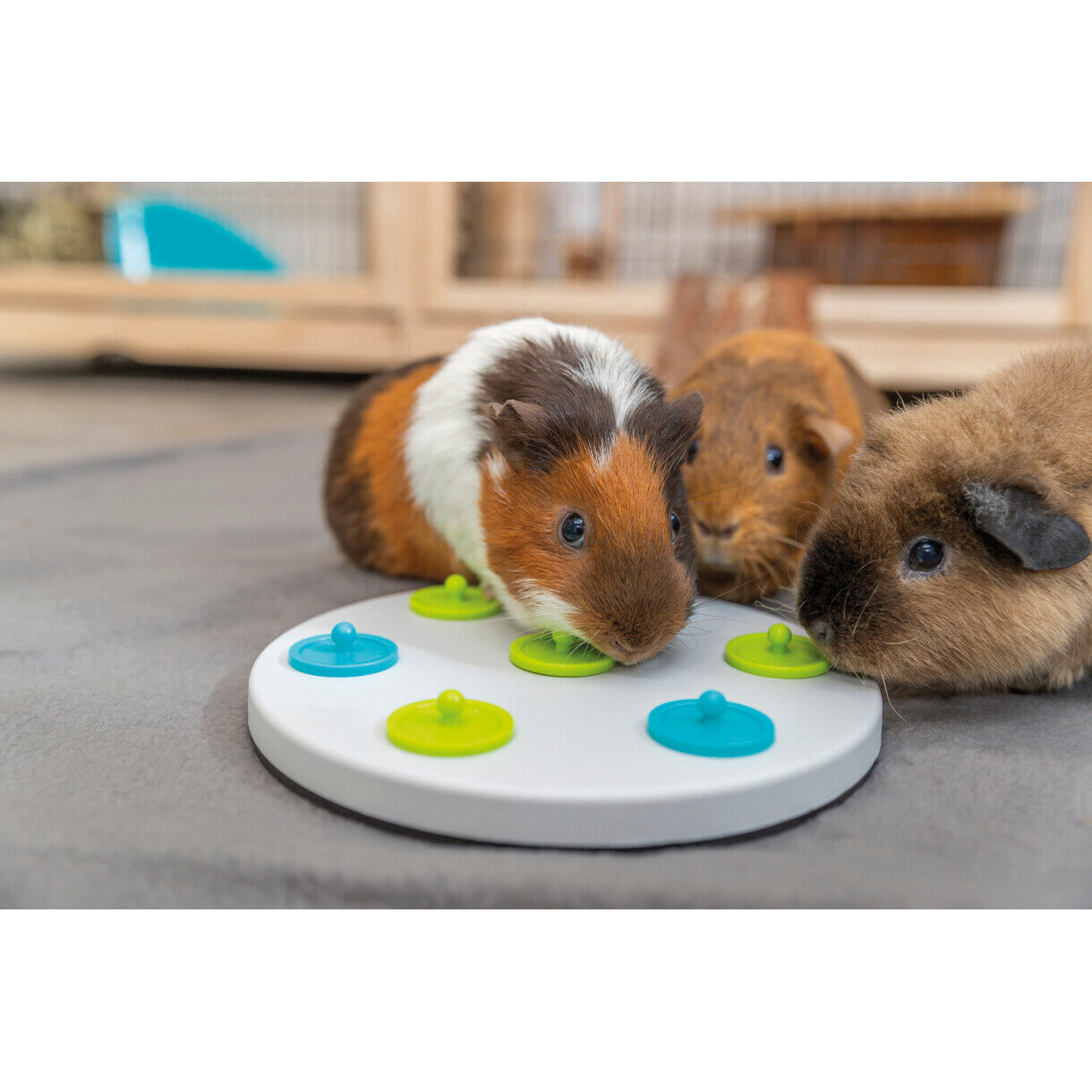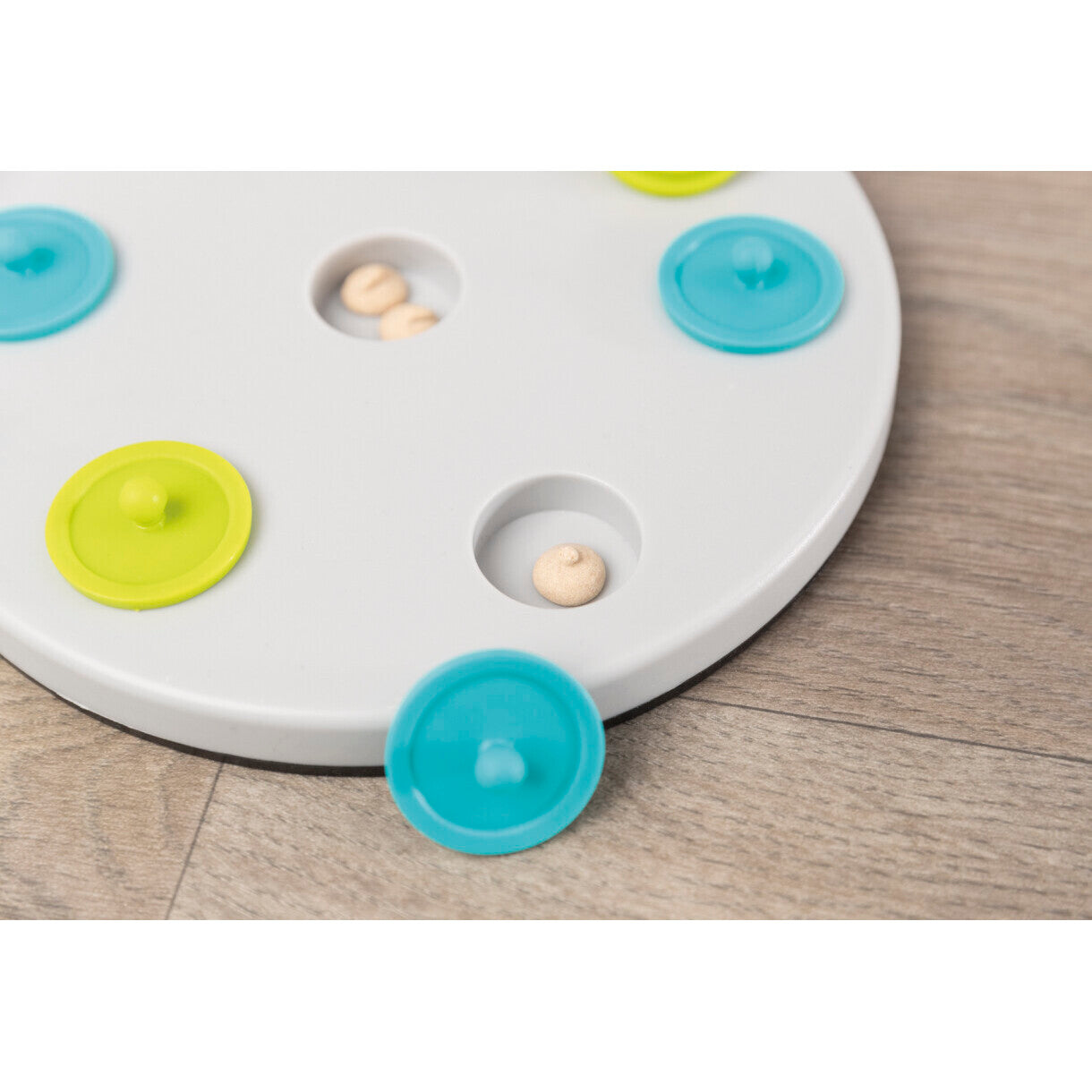 • Brett mit 7 Deckeln: das Kaninchen muss die Deckel anheben, um das Leckerli zu bekommen