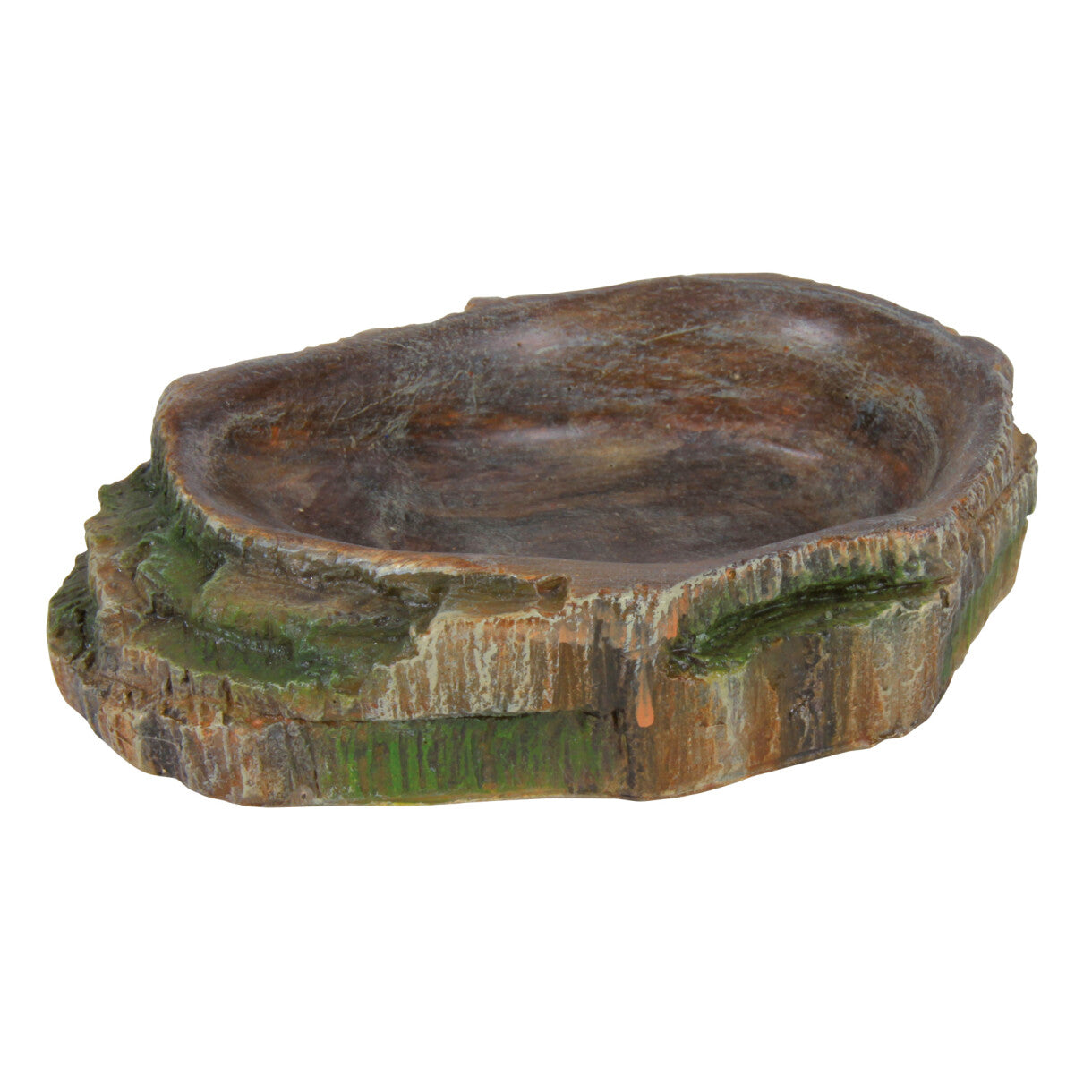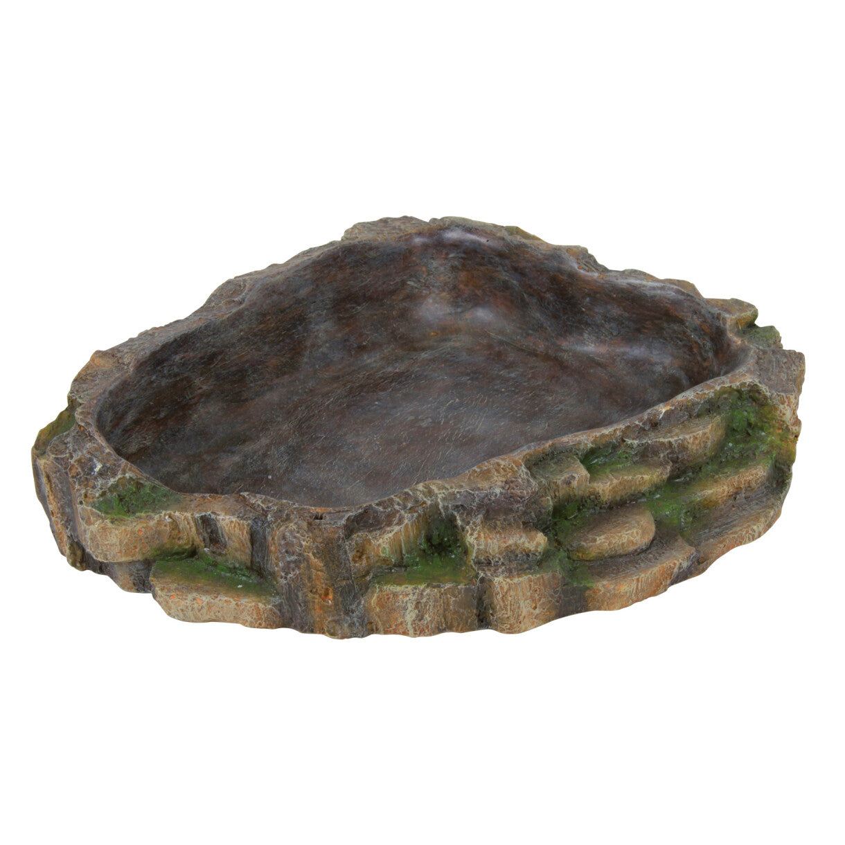 Die Wasser- und Futterschale ist aus Polyesterharz gefertigt, einem sicheren Material für den Kontakt mit Lebensmitteln. Sie hat ein natürliches Aussehen mit Regenwalddekor, das dem Terrarium ein ästhetisches Element verleiht. Die Schalen haben eine glatte Innenseite, die die Reinigung einfach und bequem macht. Dadurch sind sie ideal, um die Wasser- und Futterbedürfnisse von Reptilien und anderen Kleintieren zu erfüllen und gleichzeitig eine dekorative Dimension zu ihrer Umgebung hinzuzufügen.